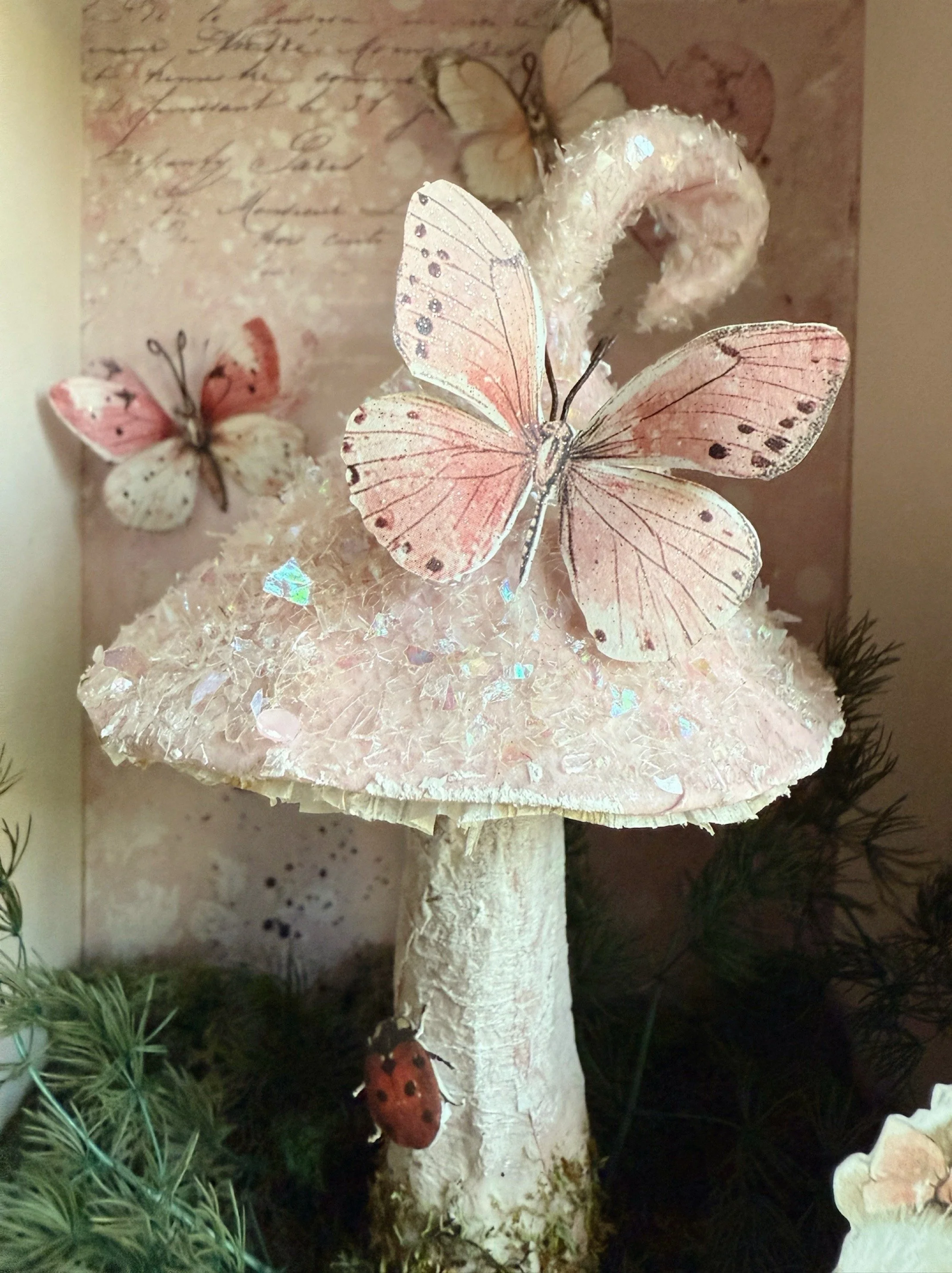 Step into a storybook world of dreamy pinks and woodland magic in this whimsical hands-on workshop. You'll create a charming paper mache mushroom terrarium, beautifully nestled inside a wooden shadowbox and adorned with delicate florals, curated ephemera, and soft textures from the Cherry Sweet collection by Frank Garcia.